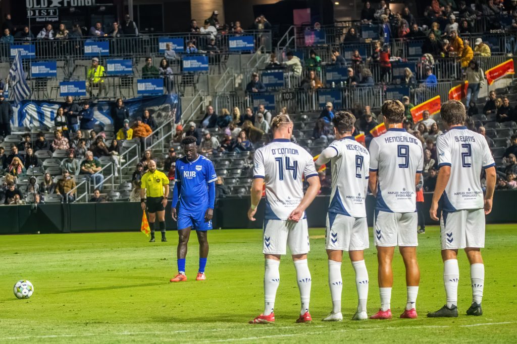 Babacar Diene, the target of the cross, didn’t make solid contact with his headed attempt but was convinced that the ball stuck the arm of Max Glasser on its way down. Having seen no infringement, Griggs waved away Knoxville’s petitions. Curiously, though, he stopped play and ruled for a drop ball to Naples. Center back Brecc Evans knelt to retie a shoelace, but that hardly necessitated a pause.