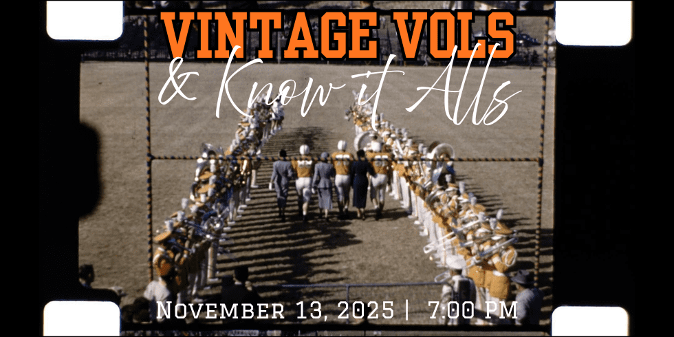 On Thursday, Nov. 13, from 7 to 9:30 p.m. at Xul Beer Co. (213 E. 5th Ave.), this 1927 reel of the UT-Vanderbilt game will be publicly screened to a crowd for the first time in almost 100 years during “Vintage Vols and Know-It-Alls,” a fundraising event for TAMIS hosted by the Friends of the Knox County Public Library. Other archival Vols footage will be shown, including a fascinating look at the 1939 team’s cross-country train trip to Pasadena to play in the Rose Bowl, as well as visits to director Clarence Brown’s ranch and the backlot of the Studios at Paramount.
